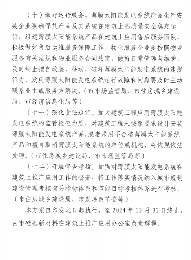 (一)新建民用建筑大力推广应用。全市城镇新建居住建筑、地上总建筑面积达到3000平方米及以上或首层占地面积达到1000平方米以上的公共建筑依法依规同步规划设计安装薄膜太阳能发电系统。